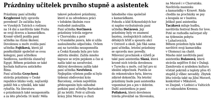 Prvním úkolem členů nového školního parlamentu bylo zjistit, jak trávili prázdniny naši učitelé. Tohoto úkolu se zhostili s velkým nadšením a výsledek si můžete přečíst ve školním newsletteru.